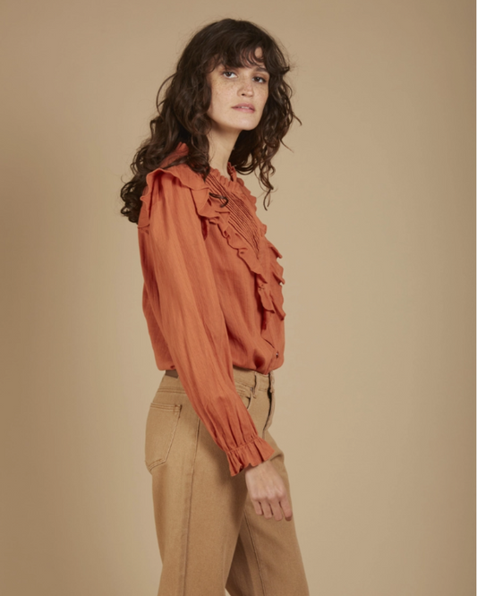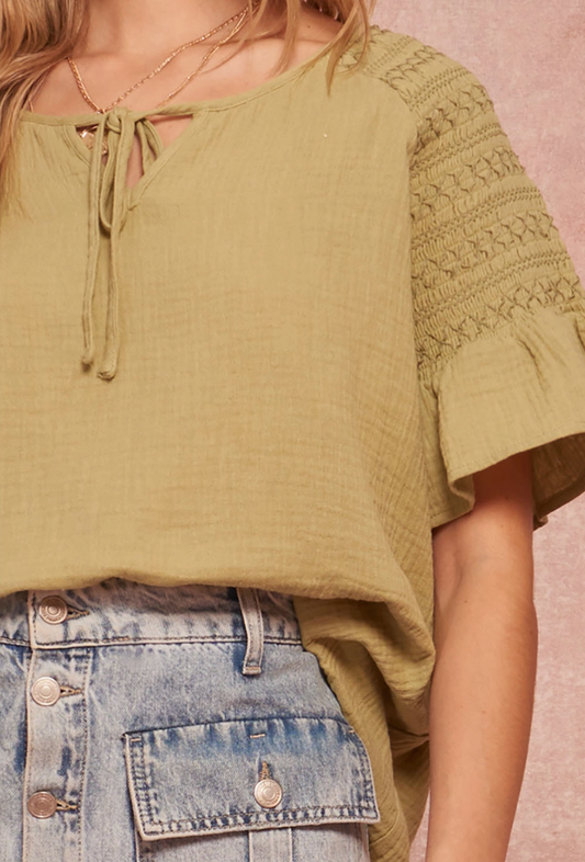 Crinkle Cotton Smocked-Sleeve Ruffled Tie-Neck Top