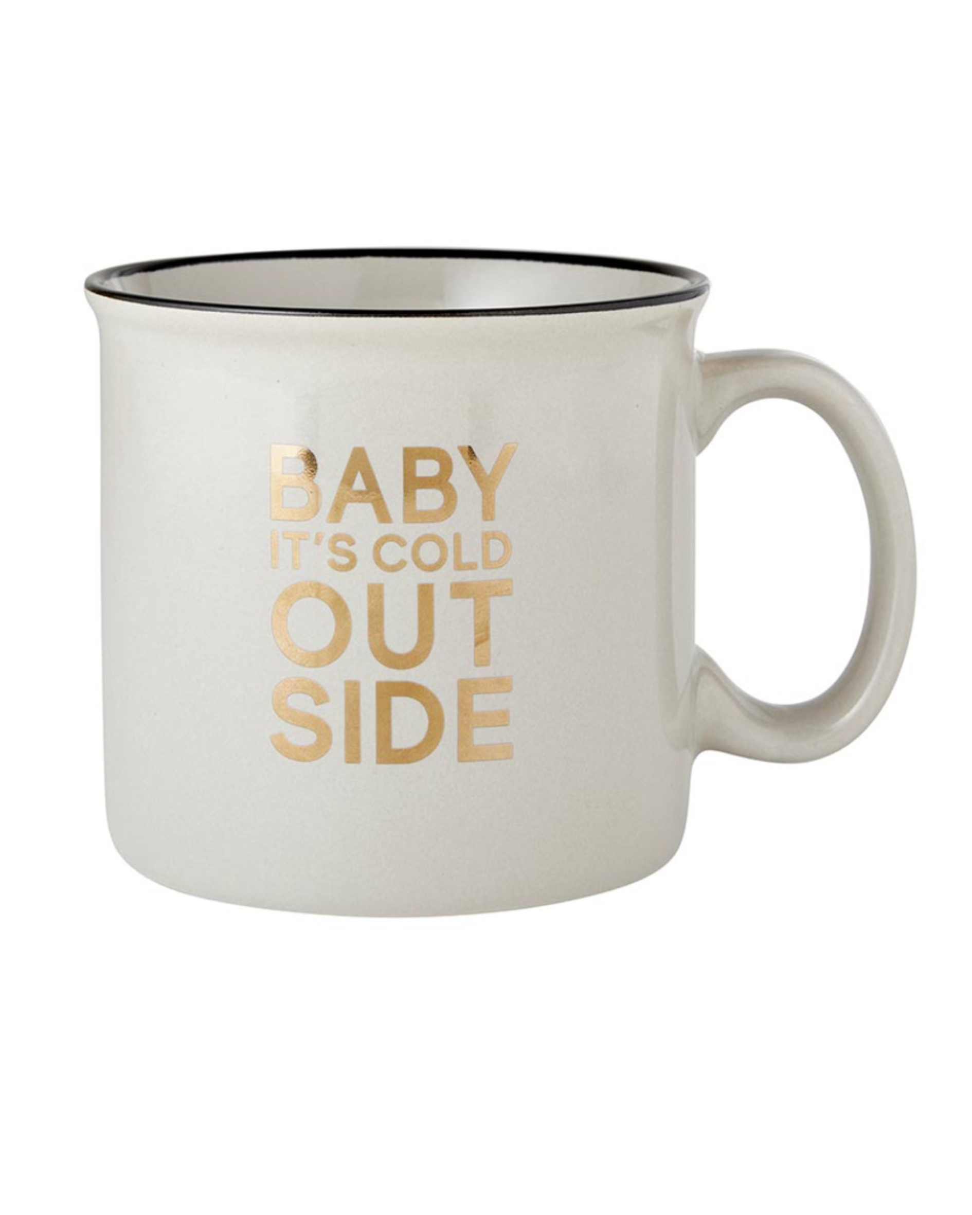 Stay cozy and cuddle up with our new Holiday mugs. Grey finish with metallic gold details.