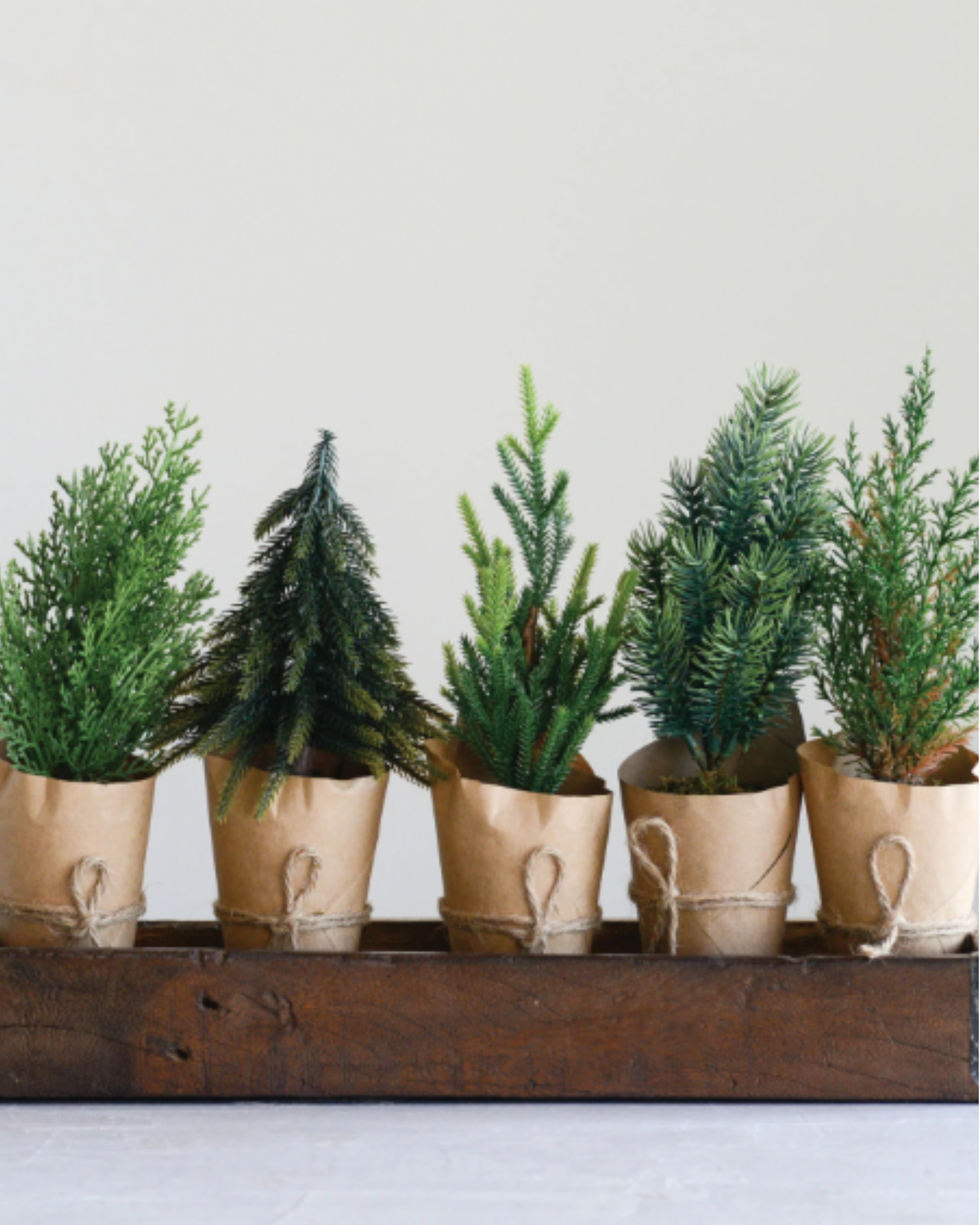 Decorative faux fern-like trees with paper-wrapped pots. Perfect for the holidays as part of your Christmas decor! The best part? No maintenance!